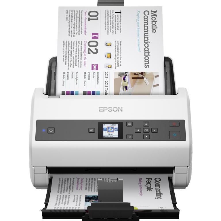 Epson WorkForce DS-870. Résolution de numérisation optique: 600 x 600 DPI, Profondeur d'affichage d'entrée de couleur: 30 bit, Profondeur d'affichage de sortie de couleur: 24 bit. Type de scanner: Alimentation feuille à feuille de scanner, Couleur du produit: Gris, Blanc, Écran: LCD. Type de capteur: CIS, Cycle de fonctionnement par jour (max): 7000 pages, Formats des fichiers numérisés: JPEG, PDF, TIFF. Capacité du chargeur automatique de documents: 100 feuilles. Taille de papier de série A ISO maximum: A4, Prise en charge des types de numérisation de support: Carte de visite, Papier plastifié, Carte postale (JPN), ISO, Format Series A (A0...A9): A3, A4, A5, A6