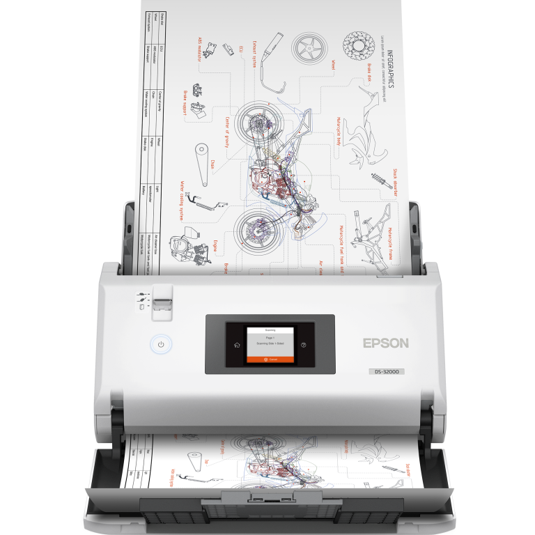 Epson WorkForce DS-32000. Surface maximal de numérisation: 304,8 x 5588 mm, Résolution de numérisation optique: 600 x 600 DPI, Profondeur d'affichage d'entrée de couleur: 30 bit. Type de scanner: Alimentation feuille à feuille de scanner, Couleur du produit: Blanc, Écran: LCD. Type de capteur: CIS, Cycle de fonctionnement par jour (max): 40000 pages, Source lumineuse: ReadyScan LED. Capacité du chargeur automatique de documents: 120 feuilles. Taille de papier de série A ISO maximum: A3, Prise en charge des types de numérisation de support: Papier ordinaire, Enveloppes, Carte postale (JPN), Carte de visite, Papier plastifié, ISO, Format Series A (A0...A9): A3, A4, A5, A6, A7, A8