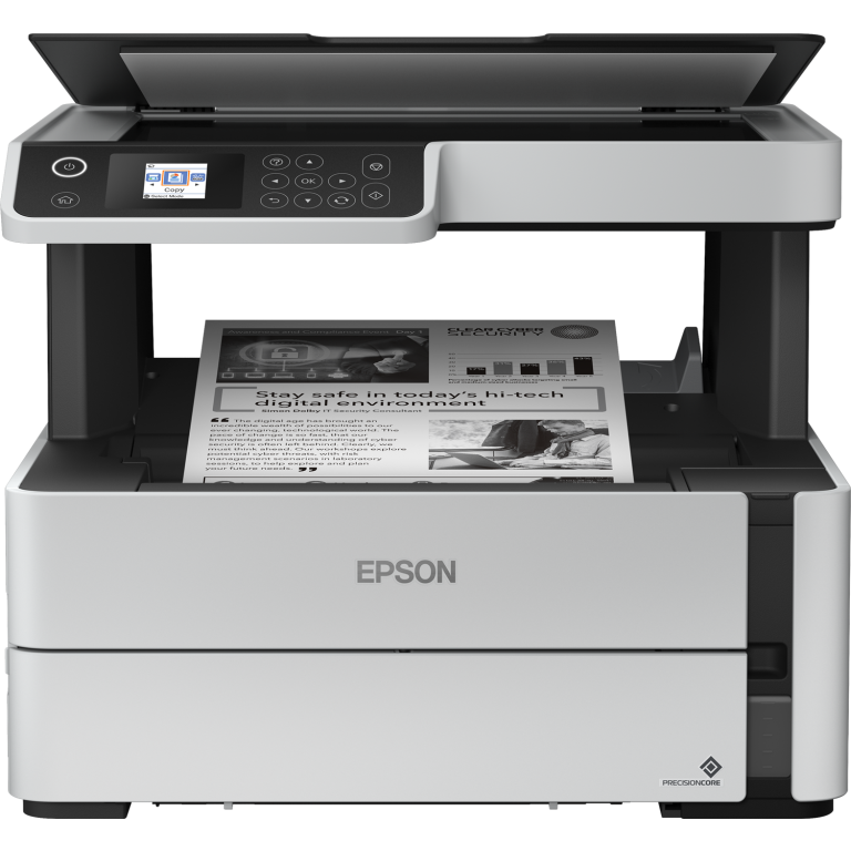 Epson EcoTank ET-M2170. Technologie d'impression: Jet d'encre, Impression: Impression mono, Résolution maximale: 1200 x 2400 DPI. Copier: Copie simple, Résolution max. des copies: 1200 x 2400 DPI. Numérisation: Numérisation couleur, Résolution de numérisation optique: 1200 x 2400 DPI. Taille de papier de série A ISO maximum: A4. Wifi. Impression directe. Couleur du produit: Noir, Gris, Blanc