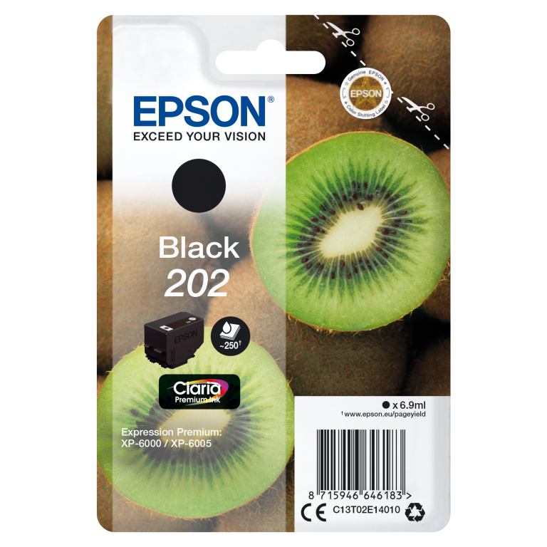 Epson Kiwi Singlepack Black 202 Claria Premium Ink. Type de cartouche d'encre: Rendement standard, Type d’encre noire: Encre à pigments, Volume d'encre noire: 6,9 ml, Couleurs d'impression: Noir, Quantité: 1 pièce(s), Rendement par page de l'encre noire: 250 pages