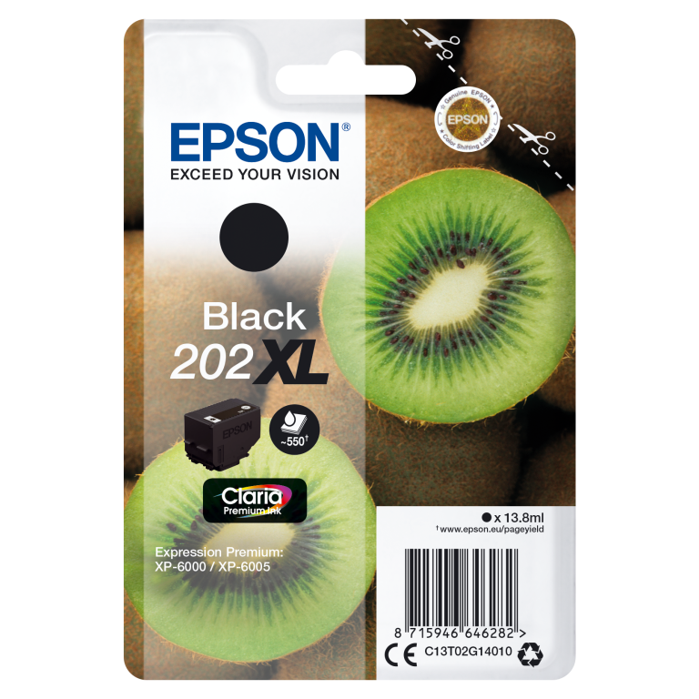 Epson Kiwi Singlepack Black 202XL Claria Premium Ink. Type de cartouche d'encre: Rendement élevé (XL), Type d’encre noire: Encre à pigments, Volume d'encre noire: 13,8 ml, Couleurs d'impression: Noir, Quantité: 1 pièce(s), Rendement par page de l'encre noire: 550 pages