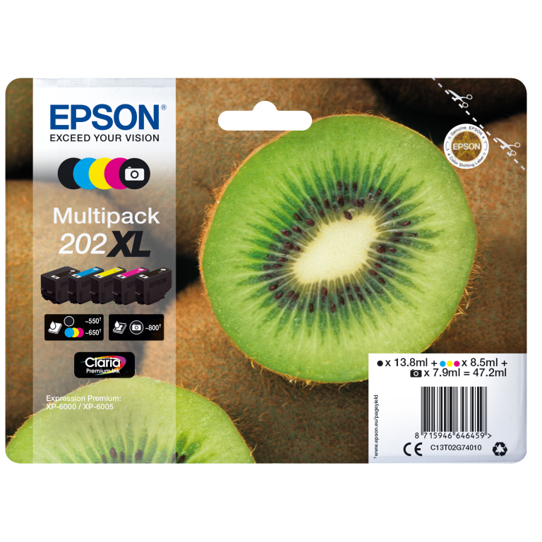 Epson Kiwi Multipack 5-colours 202XL Claria Premium Ink. Type d’encre de couleur: Encre à colorant, Type de cartouche d'encre: Rendement élevé (XL), Type d’encre noire: Encre à pigments, Volume d'encre noire: 13,8 ml, Type d'alimentation: Multi pack, Volume d'encre de couleur: 8,5 ml, Couleurs d'impression: Noir, Photo noire, Cyan, Magenta, Jaune, Quantité: 1 pièce(s)