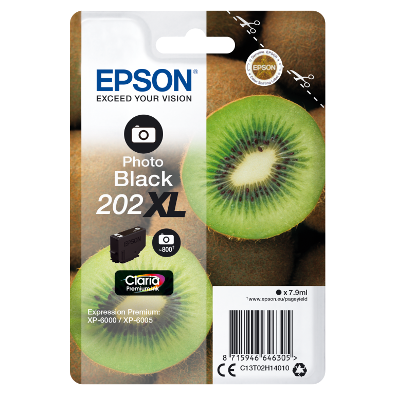 Epson Kiwi Singlepack Photo Black 202XL Claria Premium Ink. Type d’encre de couleur: Encre à colorant, Type de cartouche d'encre: Rendement élevé (XL), Volume d'encre noire: 7,9 ml, Couleurs d'impression: Photo noire, Quantité: 1 pièce(s), Rendement par page de l'encre noire: 800 pages