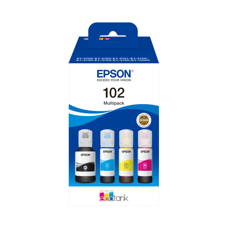 Epson 102 EcoTank 4-colour Multipack. Type: Original, Couleurs d'impression: Noir, Cyan, Magenta, Jaune, Compatibilité de marque: Epson. Quantité: 1 pièce(s), Largeur du colis: 95 mm, Profondeur du colis: 98 mm. Longueur du casier principal (externe): 493 mm, Largeur du casier principal (externe): 298 mm, Hauteur du casier principal (externe): 177 mm