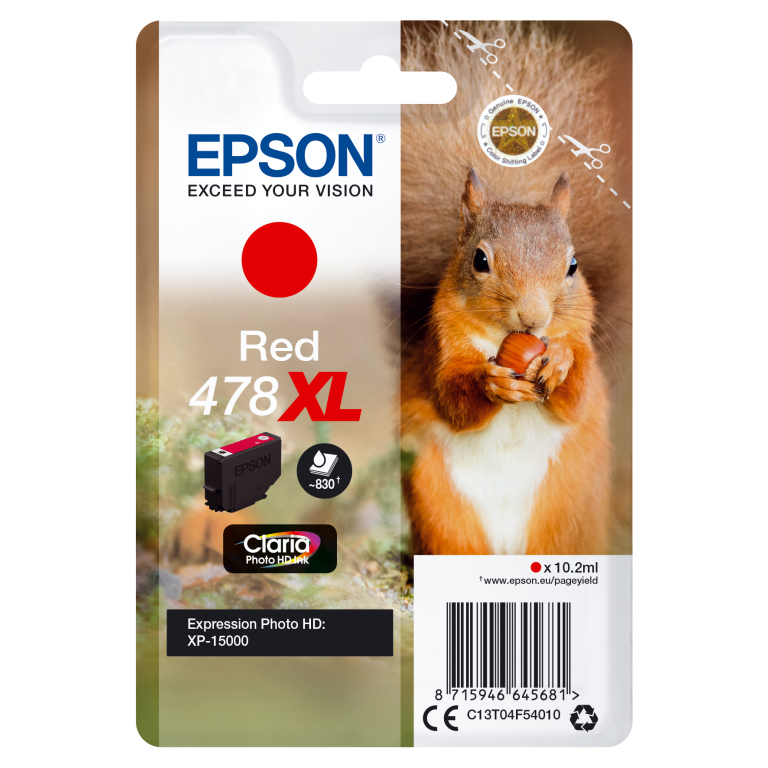 Epson Squirrel Singlepack Red 478XL Claria Photo HD Ink. Type d’encre de couleur: Encre à pigments, Type de cartouche d'encre: Rendement élevé (XL), Volume d'encre de couleur: 10,2 ml, Couleurs d'impression: Rouge, Quantité: 1 pièce(s)