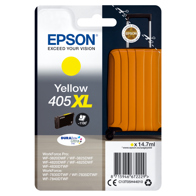 Epson Singlepack Yellow 405XL DURABrite Ultra Ink. Type d’encre de couleur: Encre à pigments, Type de cartouche d'encre: Rendement élevé (XL), Type d'alimentation: Paquet unique, Volume d'encre de couleur: 14,7 ml, Couleurs d'impression: Jaune, Quantité: 1 pièce(s)
