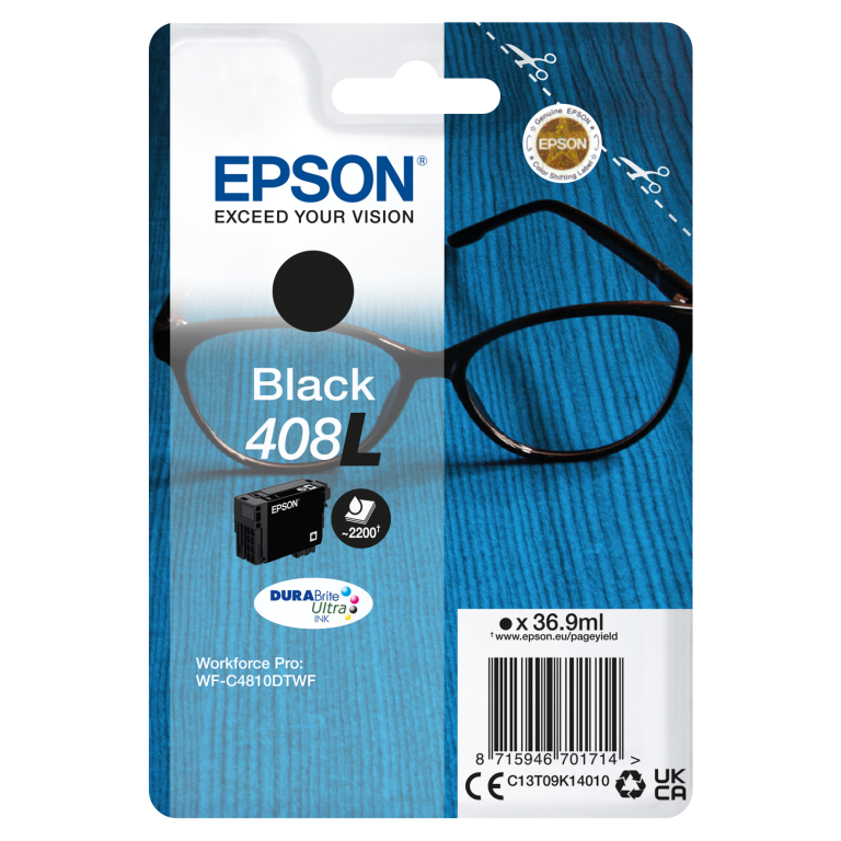 Epson Singlepack Black 408L DURABrite Ultra Ink. Type d’encre noire: Encre à pigments, Type de cartouche d'encre: Rendement standard, Volume d'encre noire: 36,9 ml, Type d'alimentation: Paquet unique, Couleurs d'impression: Noir, Quantité: 1 pièce(s), Rendement par page de l'encre noire: 2200 pages