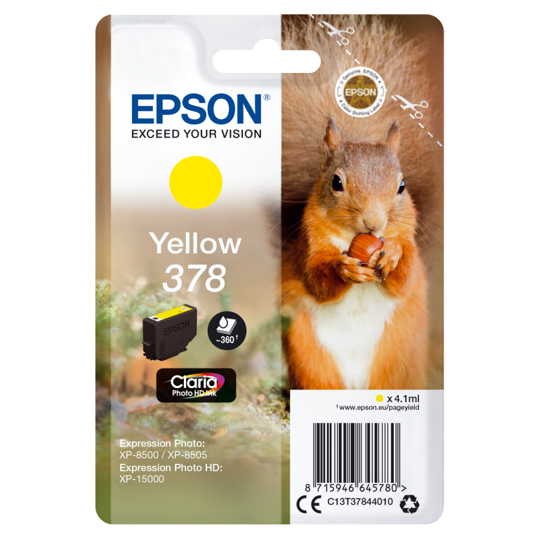 Epson Squirrel Singlepack Yellow 378 Claria Photo HD Ink. Type d’encre de couleur: Encre à pigments, Type de cartouche d'encre: Rendement standard, Rendement par page d'encre de couleur: 360 pages, Volume d'encre de couleur: 4,1 ml, Couleurs d'impression: Jaune, Quantité: 1 pièce(s)