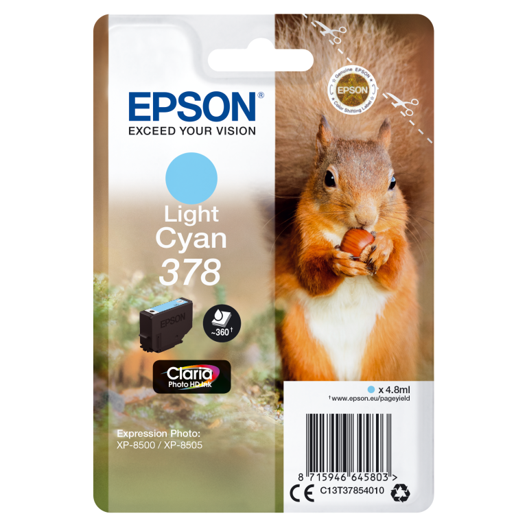 Epson Squirrel Singlepack Light Cyan 378 Claria Photo HD Ink. Type d’encre de couleur: Encre à pigments, Type de cartouche d'encre: Rendement standard, Rendement par page d'encre de couleur: 360 pages, Volume d'encre de couleur: 4,8 ml, Couleurs d'impression: Cyan clair, Quantité: 1 pièce(s)