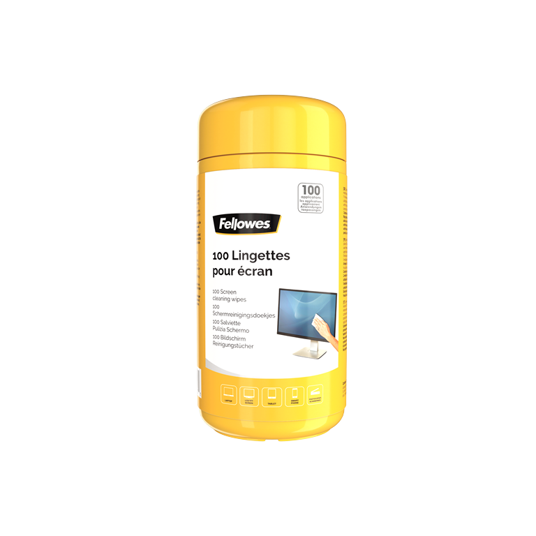 Fellowes 100 lingettes pour écran. Type de produit: Chiffons humides de nettoyage d'équipement électronique, Usage adapté: LCD/TFT/Plasma, Couleur du produit: Multicolore. Largeur: 82 mm, Profondeur: 82 mm, Hauteur: 170 mm. Quantité: 100 pièce(s). Type d'emballage: Tube. Content: 100x
